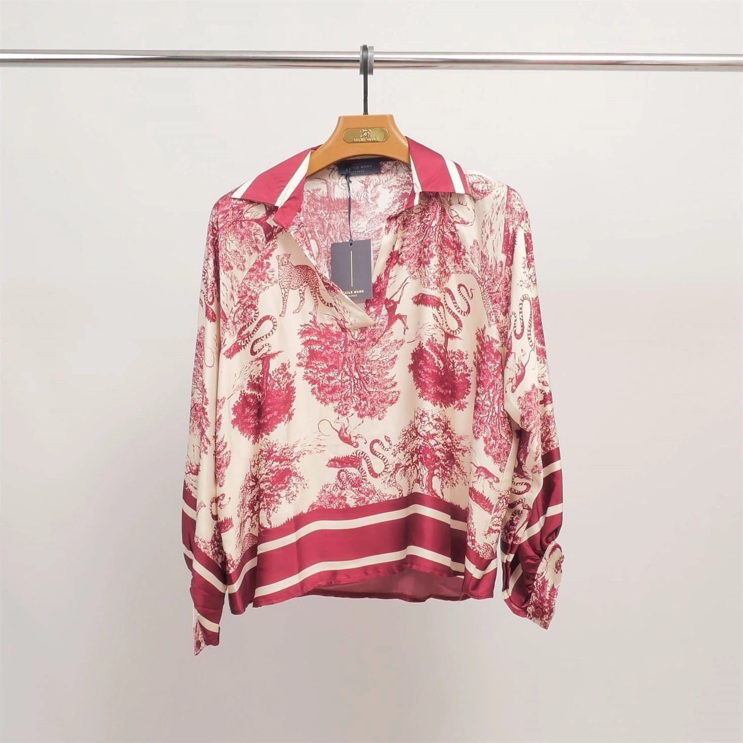 Denna flytande tunika förför med sitt djungeltryck, som skildrar en elegant vild fauna – pantrar, ormar, fåglar – inbäddad i en delikat växtmiljö. Utrustad med en kontrasterande skjortkrage, en tunisisk halsringning och knäppta manschetter, kombinerar den komfort och sofistikering i en lös och feminin passform. Kombinera med byxor, shorts eller kjol för en look som är både naturlig och sofistikerad.