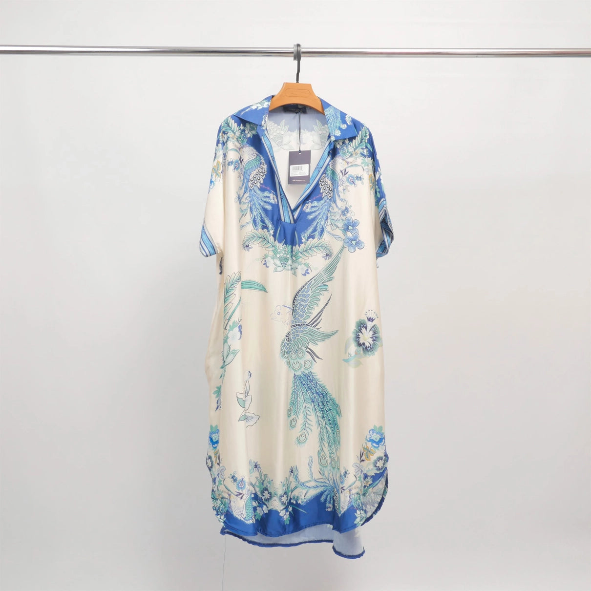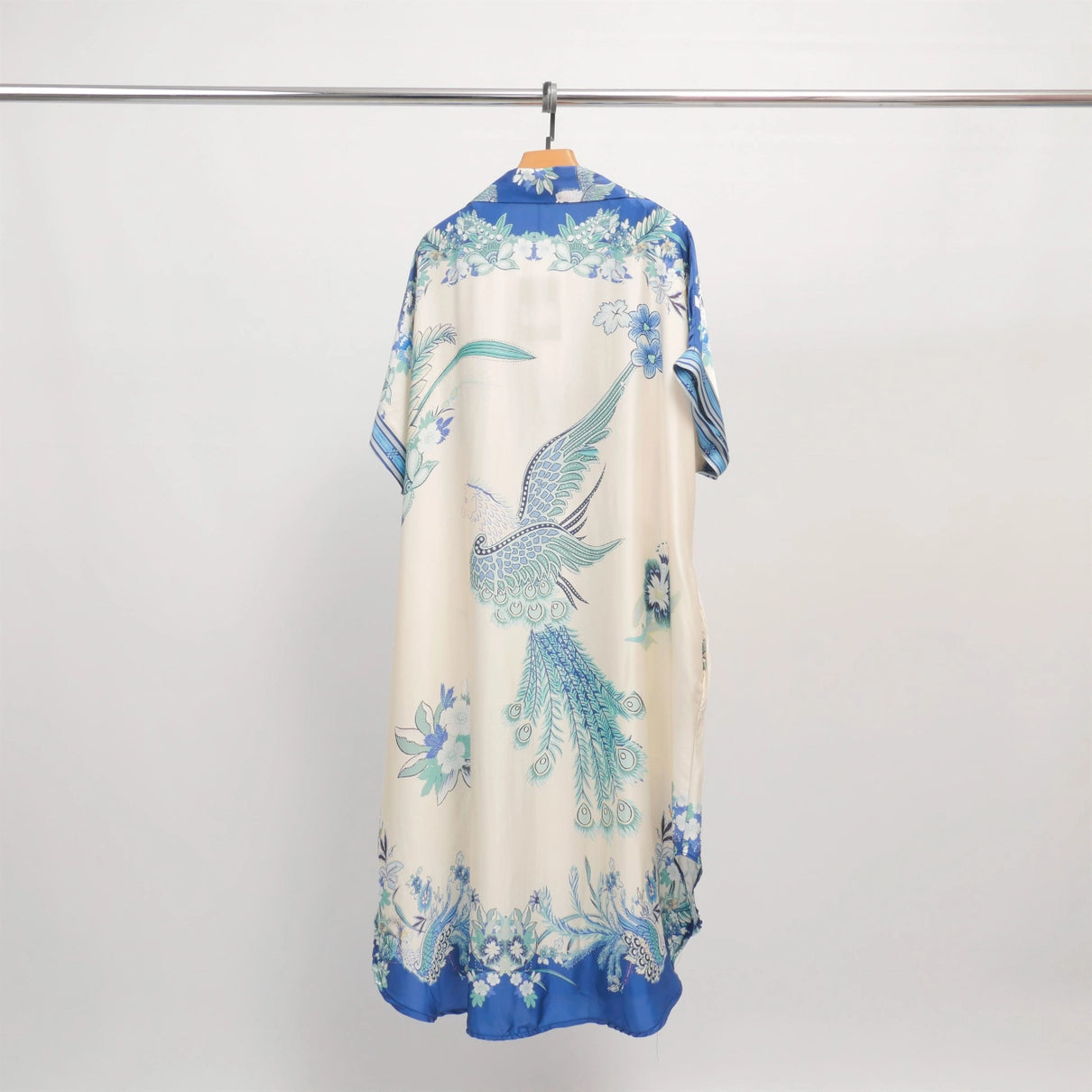 En elegant och luftig klänning med ett vackert print i blå och turkosa nyanser på en cremefärgad botten. Det exklusiva mönstret föreställer en majestätisk fågel med lång fjäderskrud omgiven av blommor, vilket ger plagget en lyxig och konstnärlig känsla. Perfekt att bära både till vardags och vid speciella tillfällen – matcha med sandaler för en avslappnad look eller klä upp med klackar och smycken för en elegant kvällsstil.