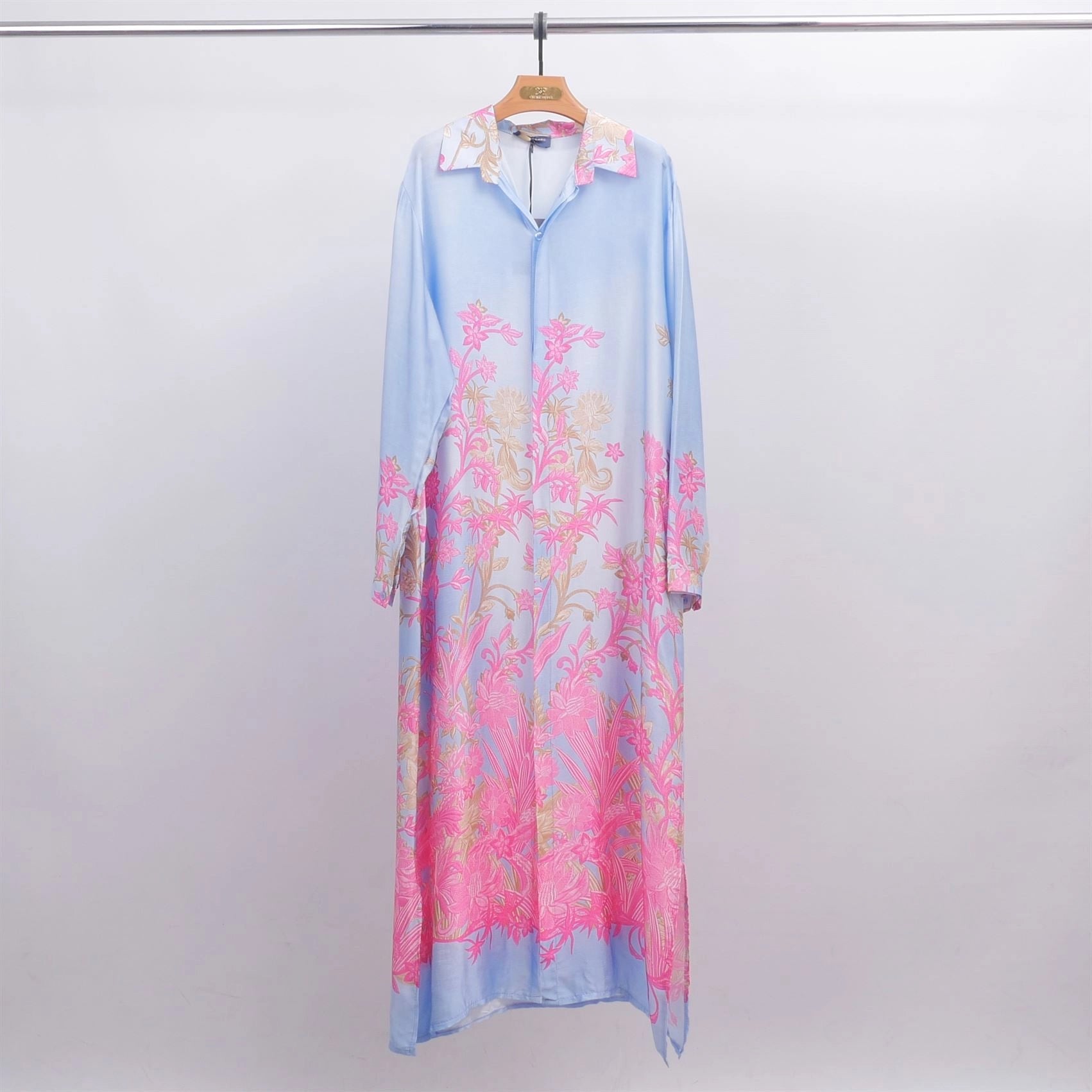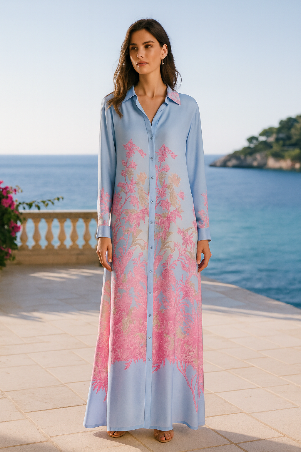 Lång skjortklänning med tryck, perfekt för svala sommarkvällar. Slits i sidorna för extra bekvämlighet och fina rörelsemönster.