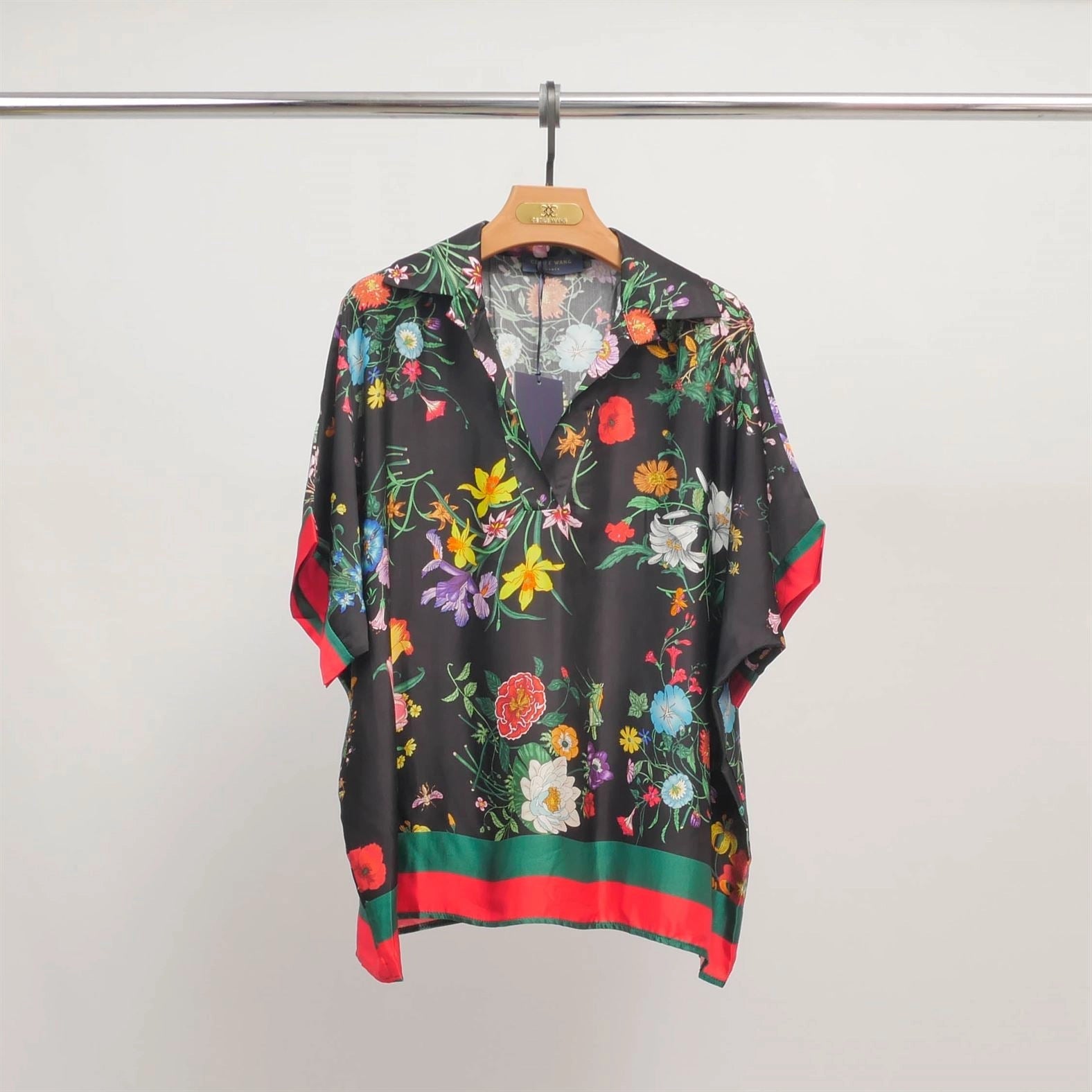 En explosion av blommor och lätthet för denna flytande tunika med en självsäker bohemisk elegans. Med sin rymliga passform, korta ärmar och öppna krage i skjortstil, förför den med sitt luftiga fall och sitt livfulla blommönster, tillgängligt på ljus eller svart bakgrund. De kontrasterande avslutningarna vid basen och ärmarna ger en sofistikerad grafisk touch. Den delikata blandningen av viskos och silke erbjuder en exceptionell mjukhet och en subtil glans, perfekt för att lysa upp dina sommaroutfits.
