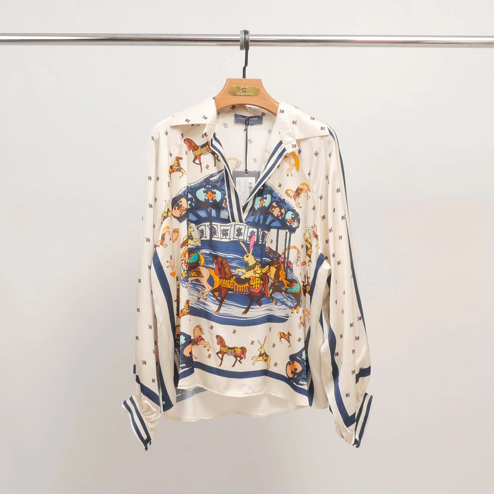 En vind av nostalgi blåser över denna lätta blus med ett förtrollat karuselltryck. Illustrerad med trähästar, lekfulla figurer och festliga detaljer, framkallar den barndomens magi med en touch av elegans. Dess lösa passform, skjortkrage med öppen hals och randiga manschetter ger balans och originalitet. Bär den men ett par enkla byxor, till vardag eller fest.
